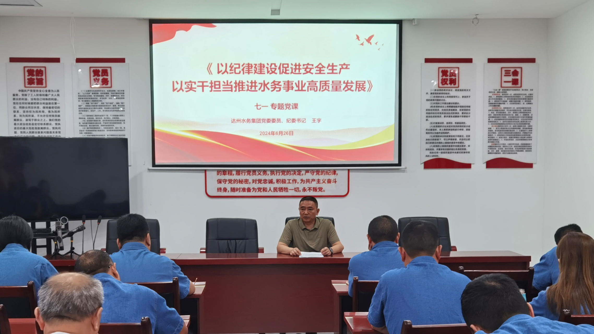6月26日上午集團(tuán)公司黨委委員、紀(jì)委書記王宇同志惠潤(rùn)達(dá)公司支部以《以紀(jì)律建設(shè)促進(jìn)安全生產(chǎn) 以實(shí)干擔(dān)當(dāng)推進(jìn)水務(wù)事業(yè)高質(zhì)量發(fā)展》為主題,講了一堂專題黨課。