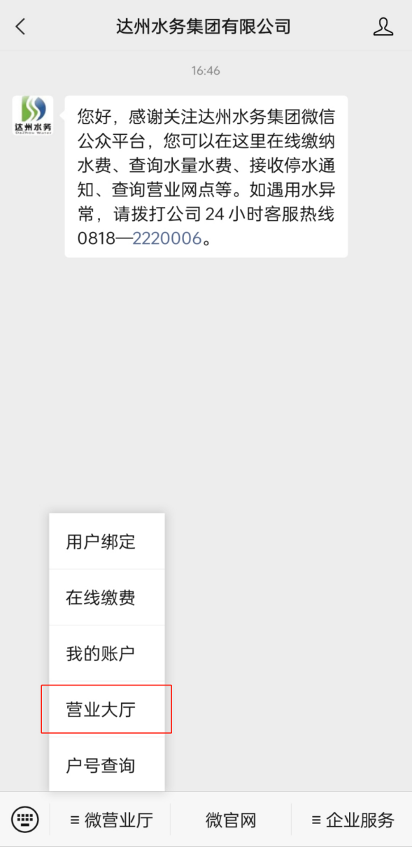 關注“達州水務集團有限公司”公眾號,點擊“微營業(yè)廳”中的“營業(yè)大廳”。
