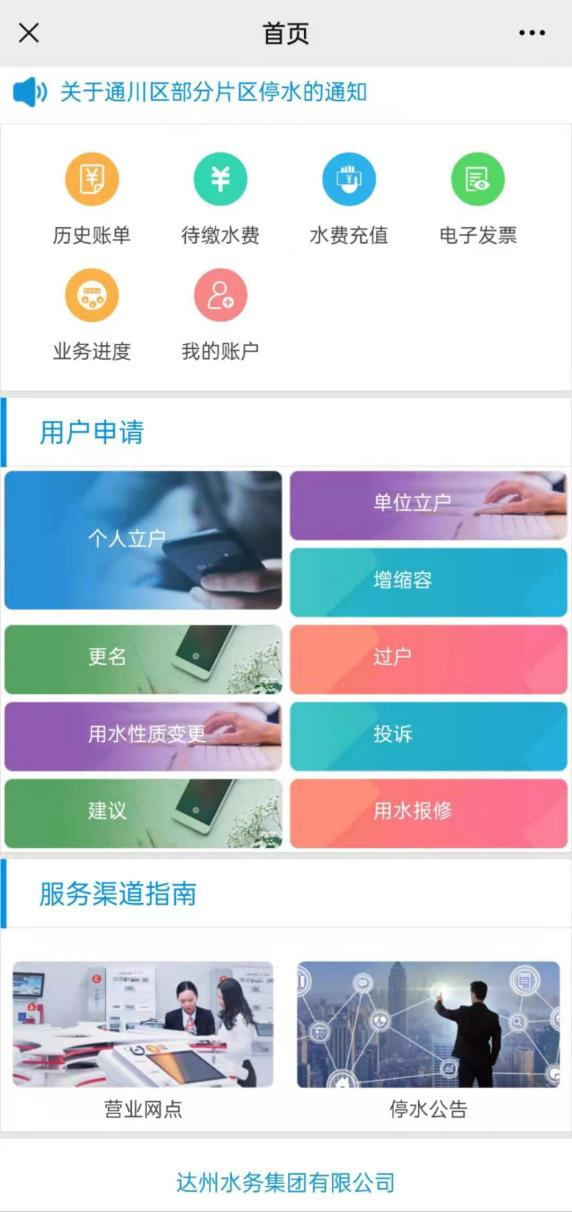 達州水務“微營業(yè)廳”已正式進駐“達州水務集團有限公司”微信公眾號,關注微信公眾號,多項供水業(yè)務均可網上辦理。用水報裝、更名過戶、增縮容、用水性質變更、用水報修、水費查詢、充值繳費、電子發(fā)票下載等業(yè)務均可“掌上辦”。
